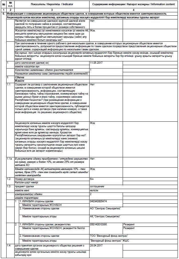 Настоящим АО "Сентрас Секьюритиз" (далее – Общество) сообщает, что 11 мая 2017 года Обществом заключена сделка с аффилиированным лицом Общества - с ТОО "Венчурный фонд Сентрас", а именно Соглашение, в целях передачи бессрочных лицензий Microsoft, в АО "Сентрас Секьюритиз"- как сделки, в совершении которой у Общества имеется заинтересованность